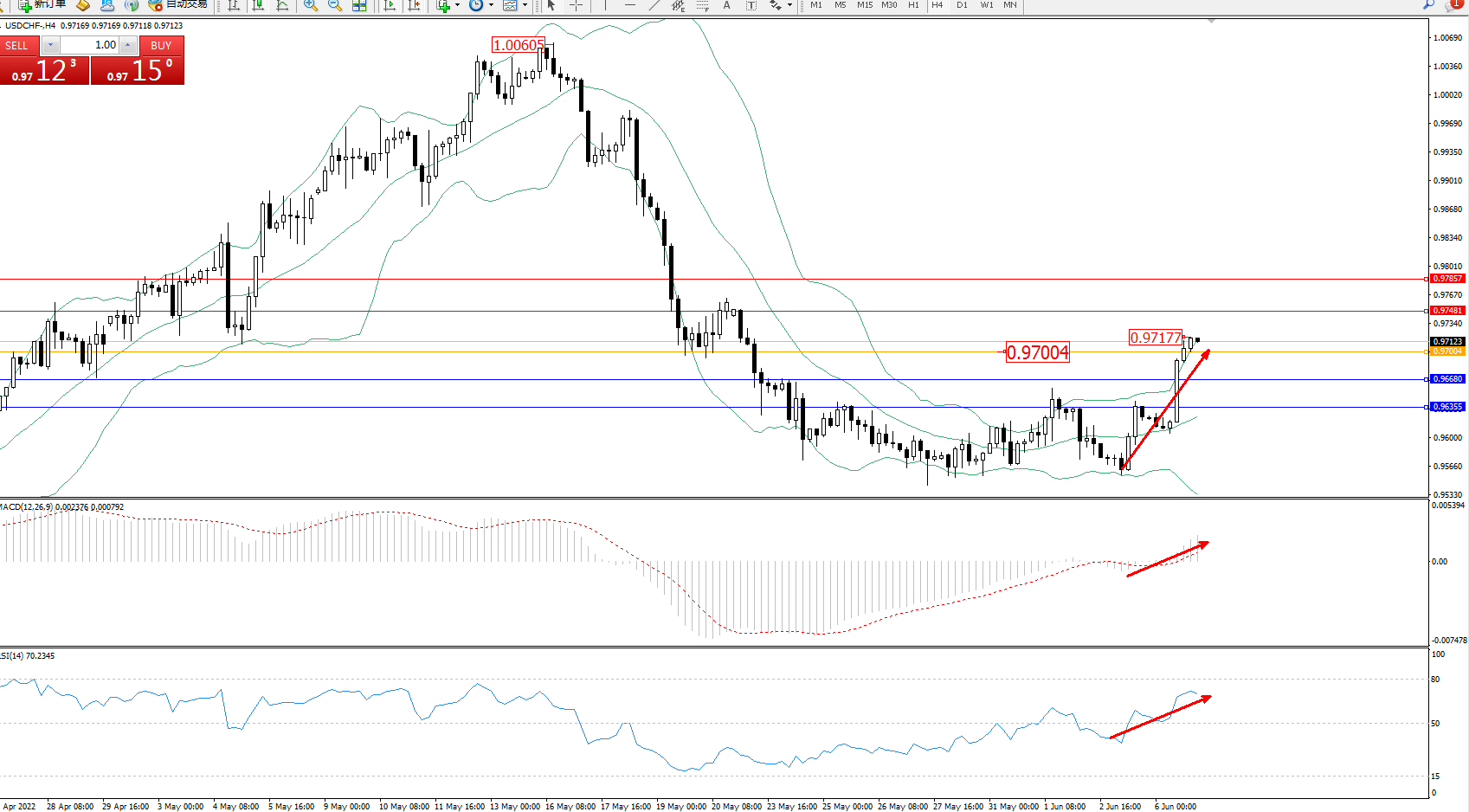 交易策略:0.97004上方看涨,目标0.97481、0.97857