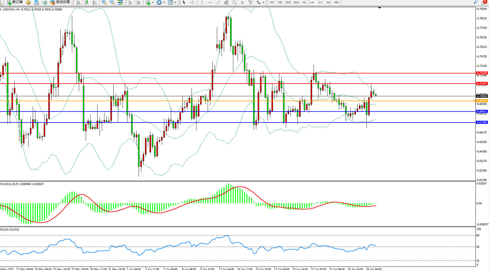 美元人民币USDCNH——4小时K线图显示: