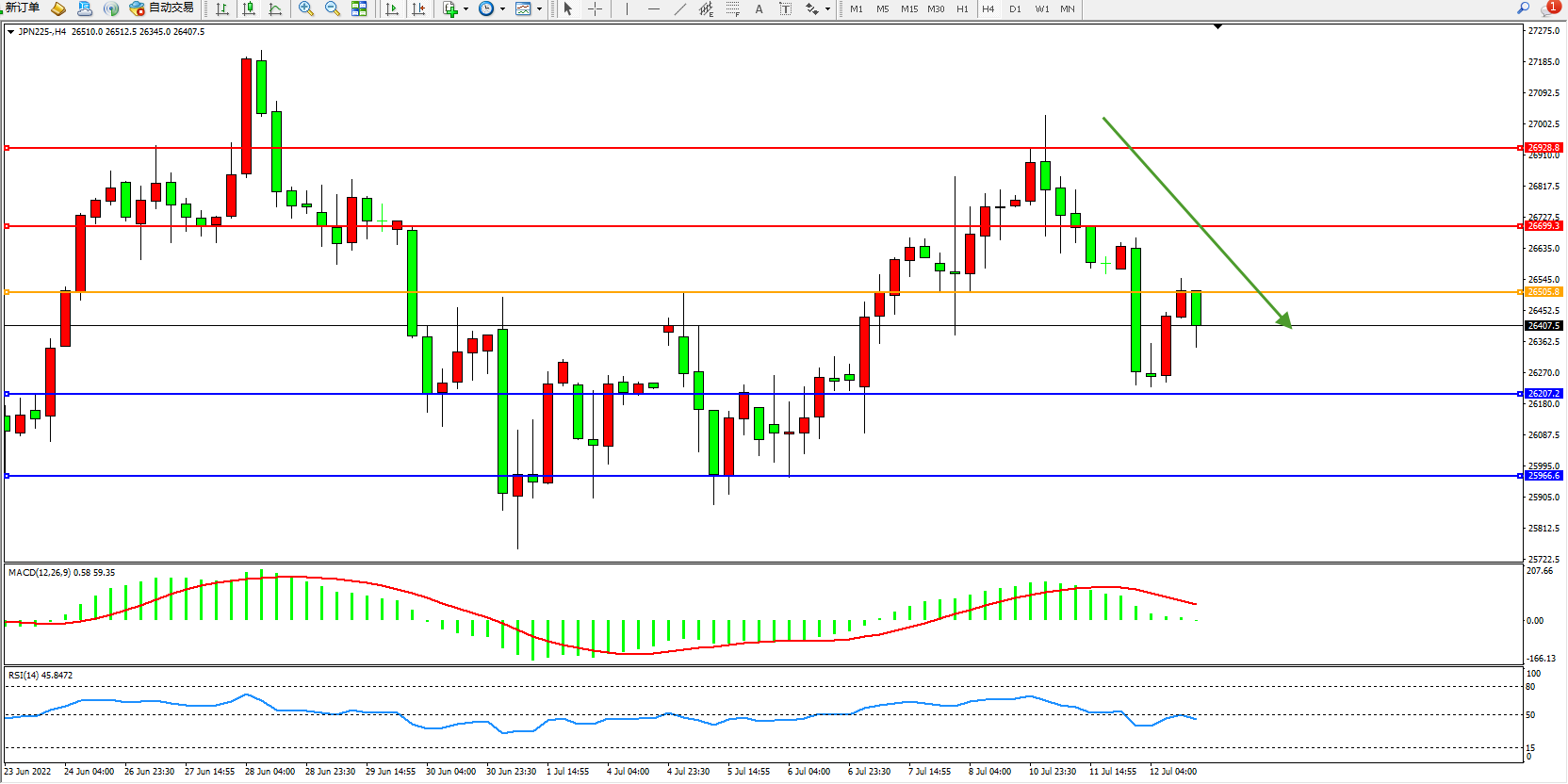 日经指数JPN225——4小时K线图显示: