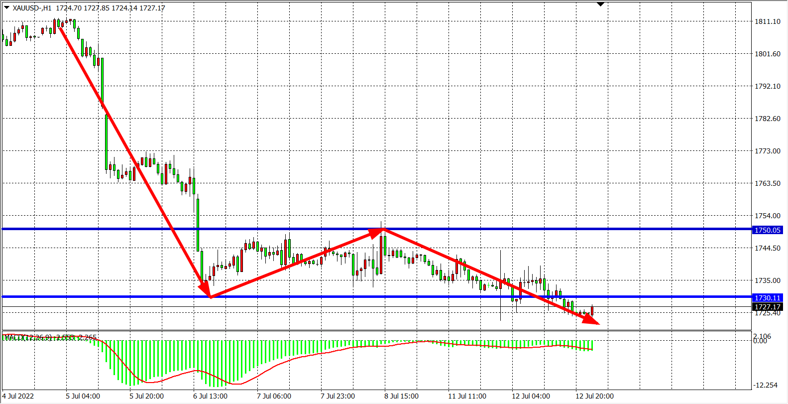 1小时图看,金价多次反弹1740上破未果,随后回落跌破1730,同时MACD量能在零轴之下放大,中枢点继续下移,趋势进一步走空,第一阻力1730,第二阻力1740,在阻力之下看空为主。