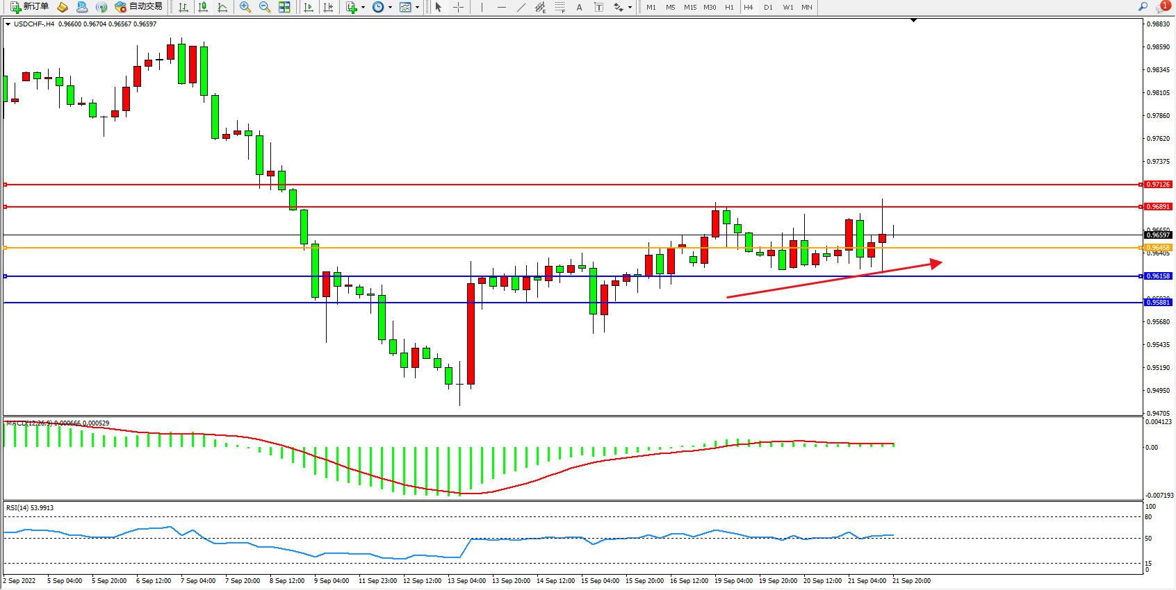 交易策略:0.96458上方看涨,目标0.96891、0.97126