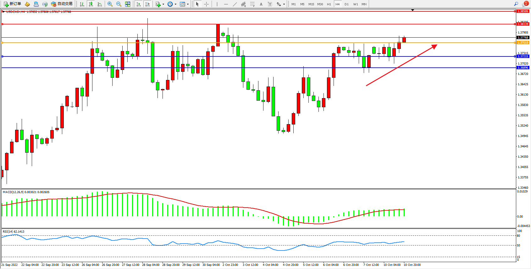 美元加元USDCAD——4小时K线图显示: