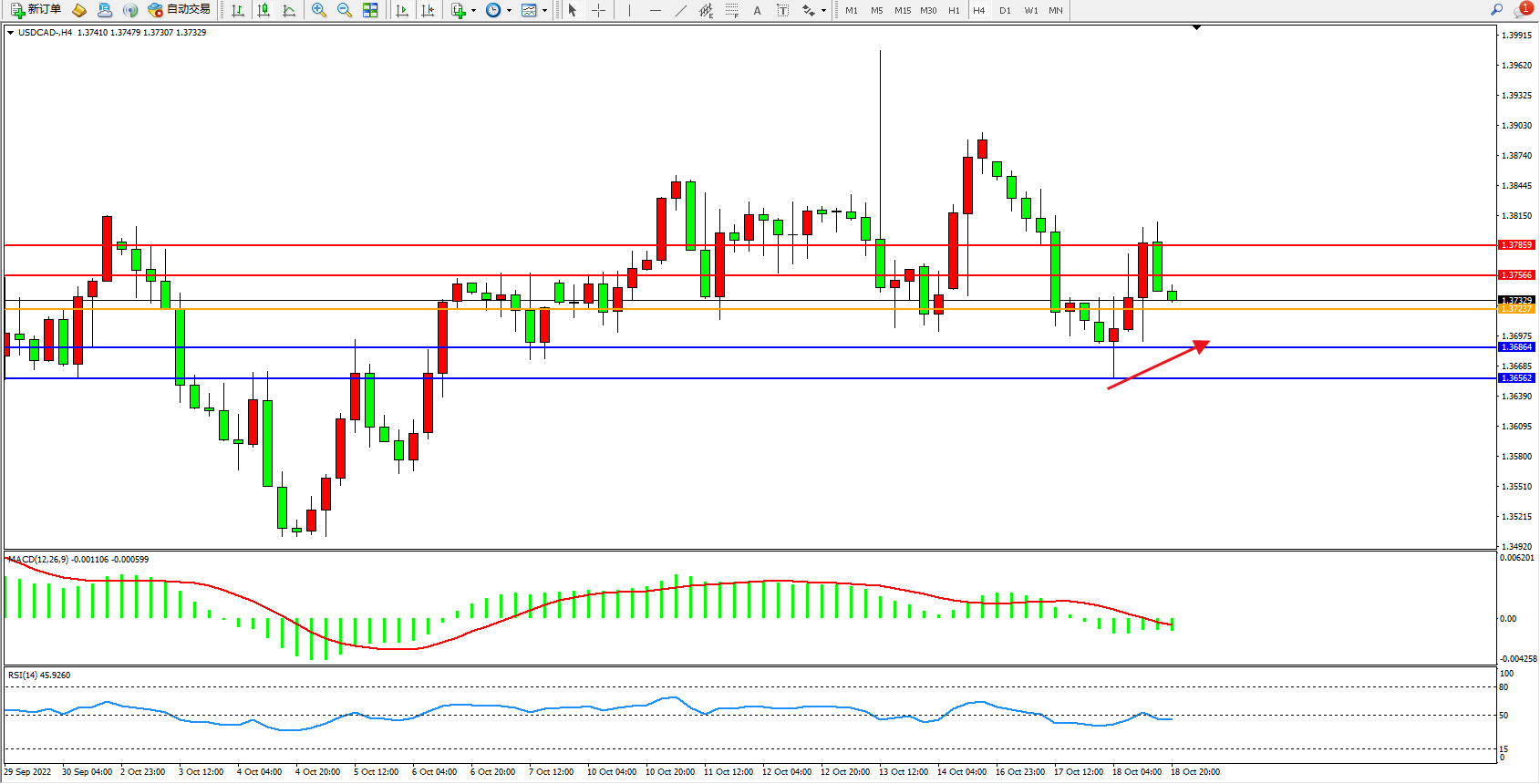 美元加元USDCAD——4小时K线图显示: