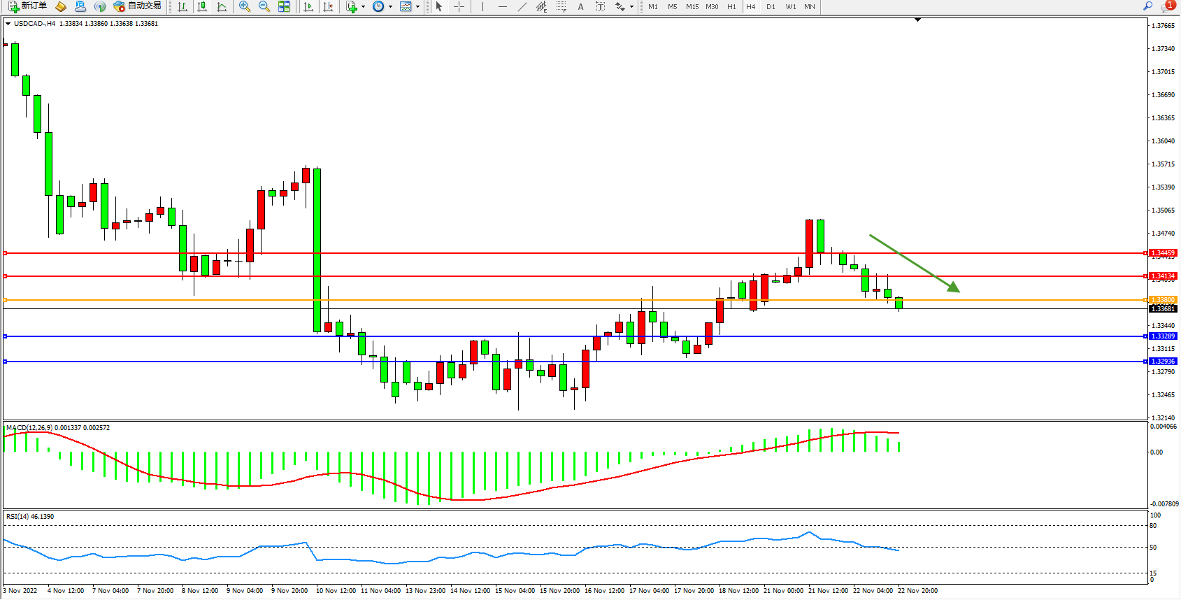 美元加元USDCAD——4小时K线图显示: