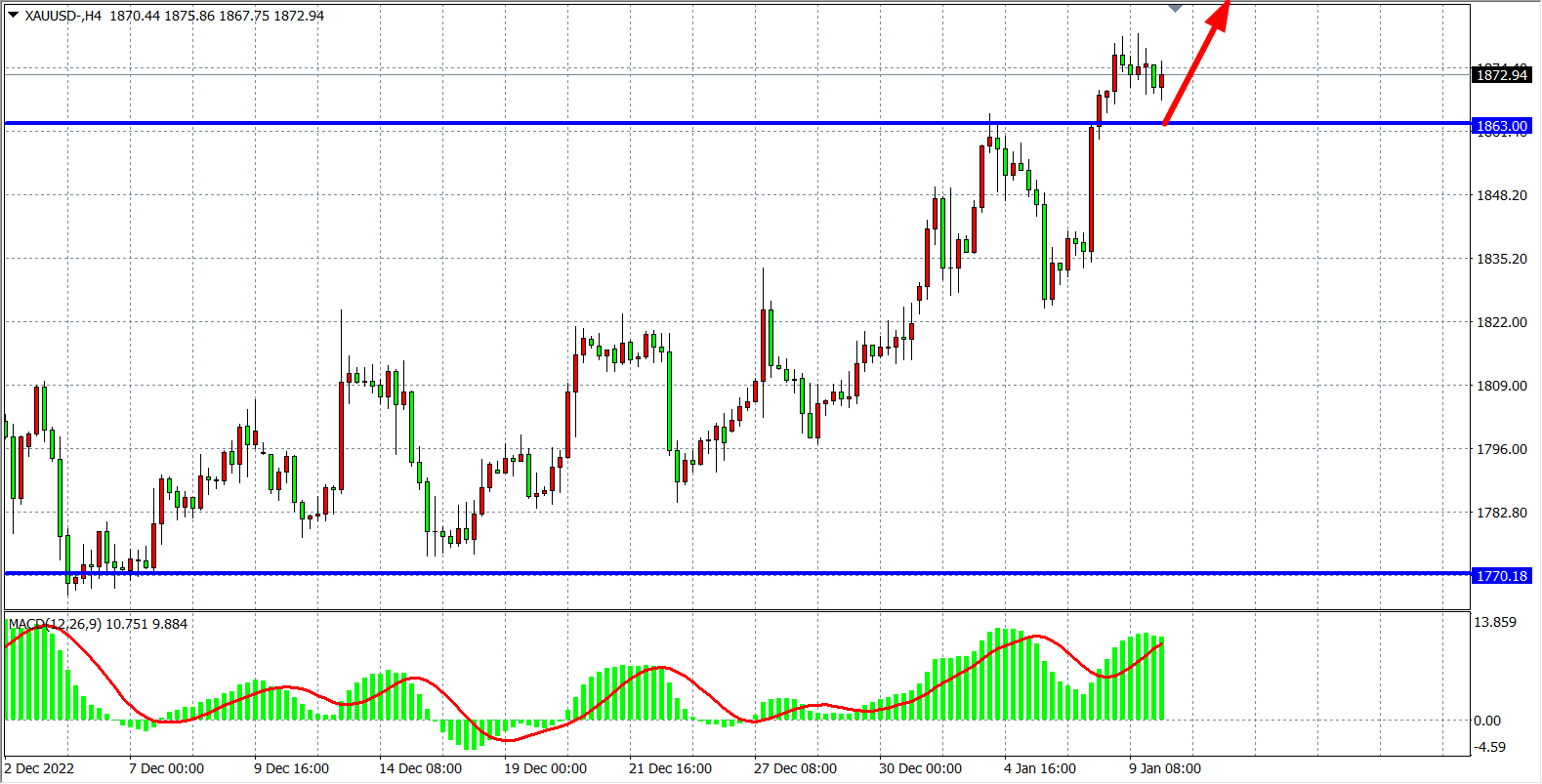 周一(1月10日)因市场押注近期经济数据将促使美联储放慢加息步伐,现货黄金一度上破1880美元