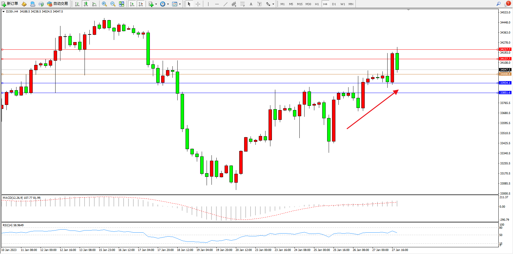 道琼斯指数DJ30——4小时K线图显示: