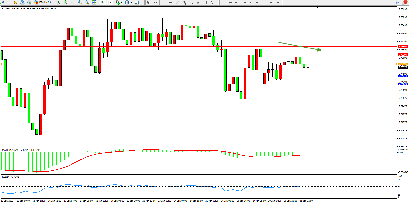 交易策略:6.75596下方看跌,目标6.74713、6.74130