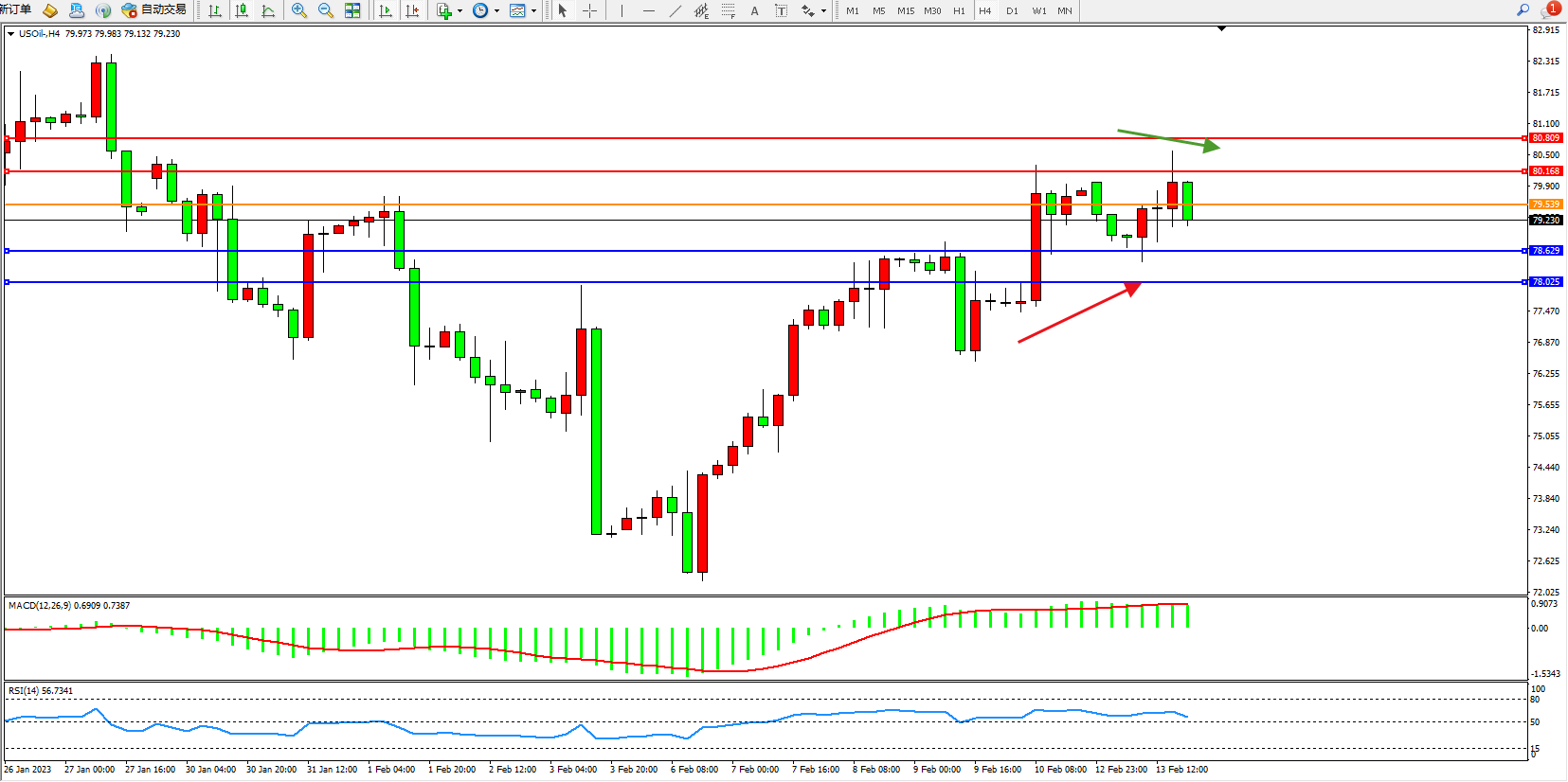 备选策略:79.539上方看涨,目标80.168、80.809