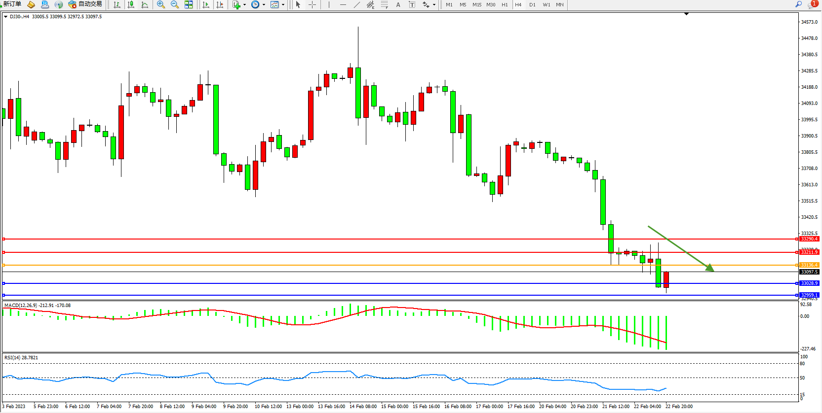 道琼斯指数DJ30——4小时K线图显示:
