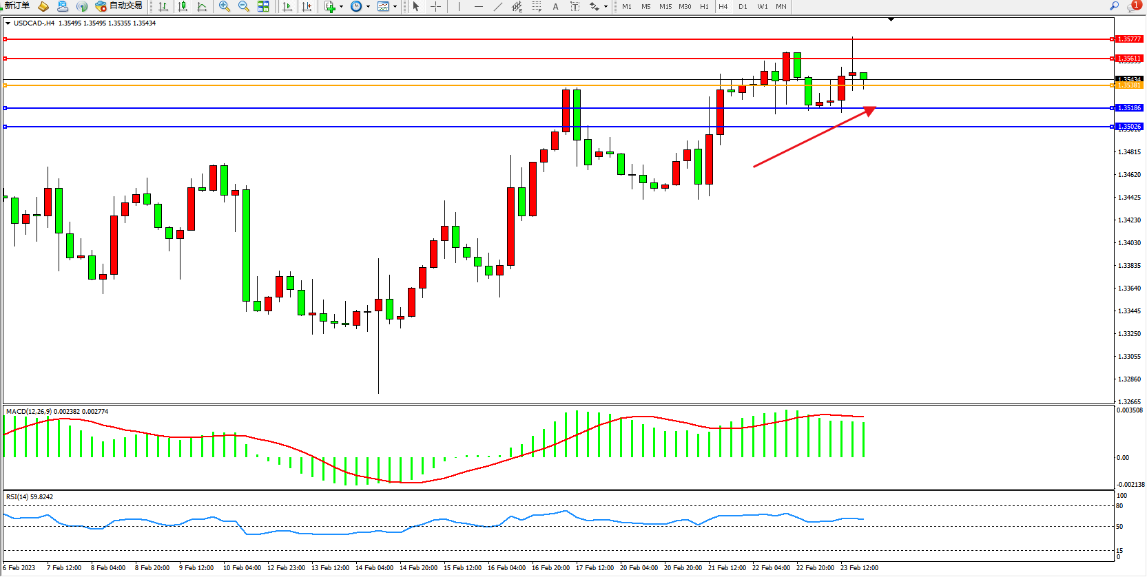 美元加元USDCAD——4小时K线图显示: