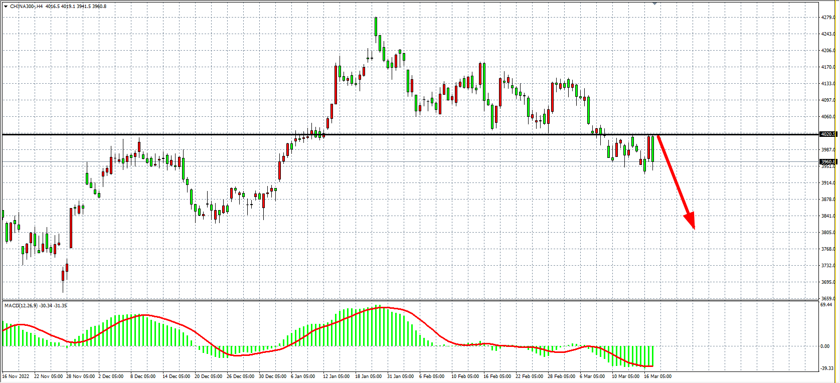 4小时图看,沪深300在4020之下继续走弱,压力再度显现,同时MACD于零轴之下量能依旧较大,显示空头动能仍强劲,阻力关注4020,日内在4020之下继续看跌,下方目标3900-3850附近。