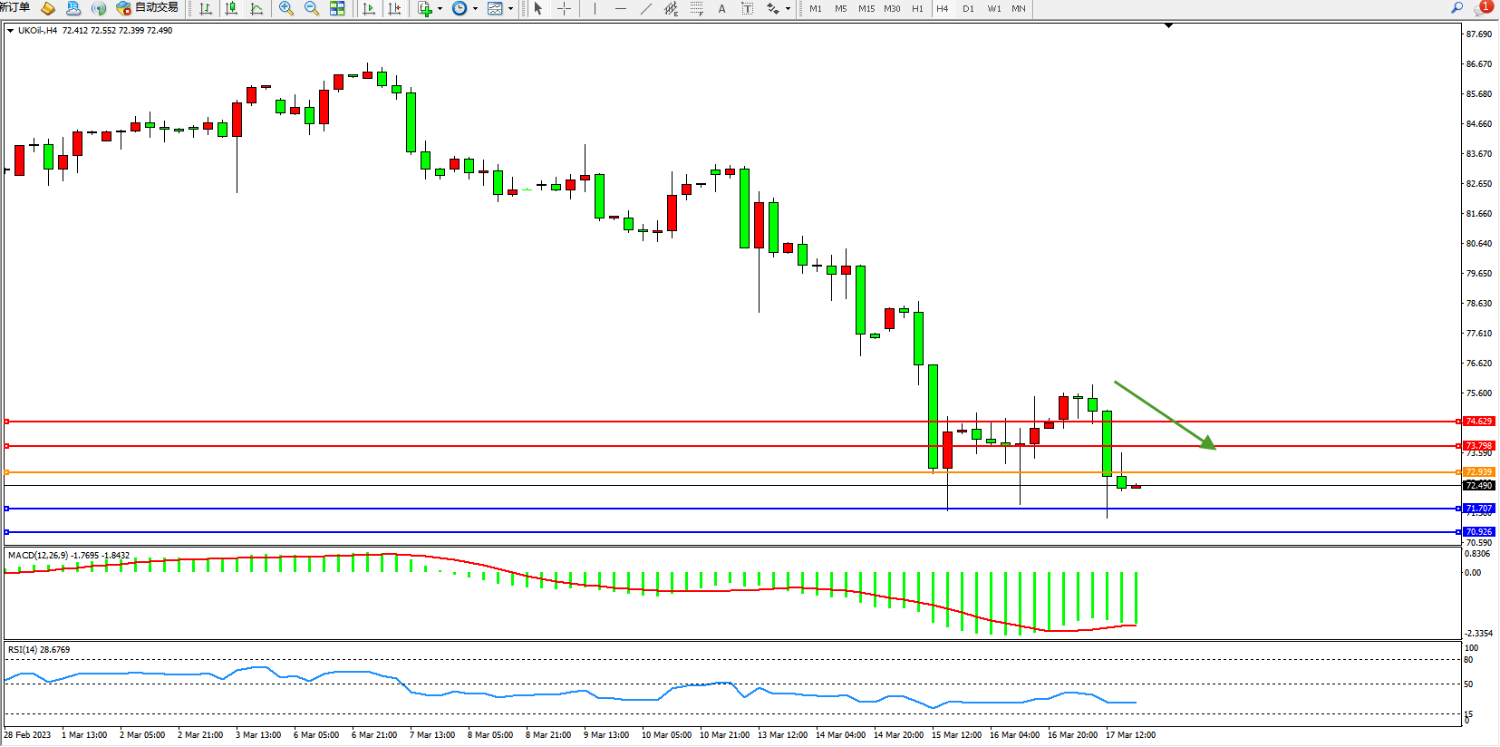 交易策略:72.939下方看跌,目标71.707  70.926