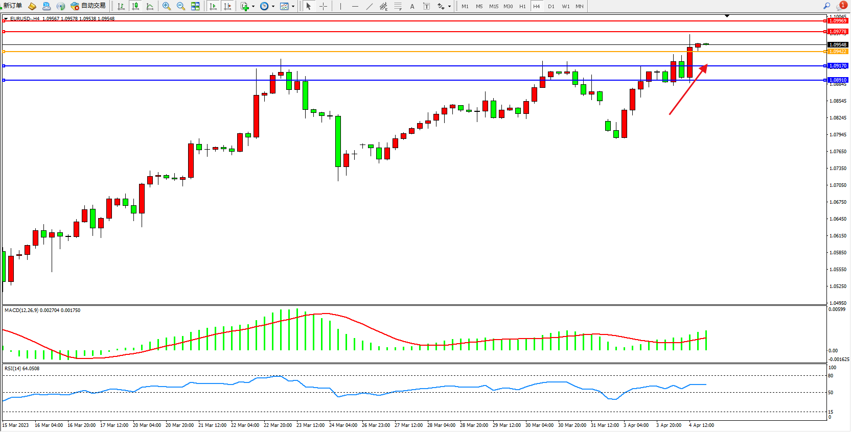 4小时图看:高位短期持续震荡上扬,多头拉升情绪涌现,市场不断向上移动中,MACD指标处于多头区域不断上移,RSI指标处于多头区域整理中;