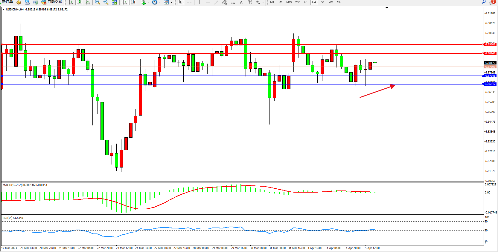 美元人民币USDCNH——4小时K线图显示: