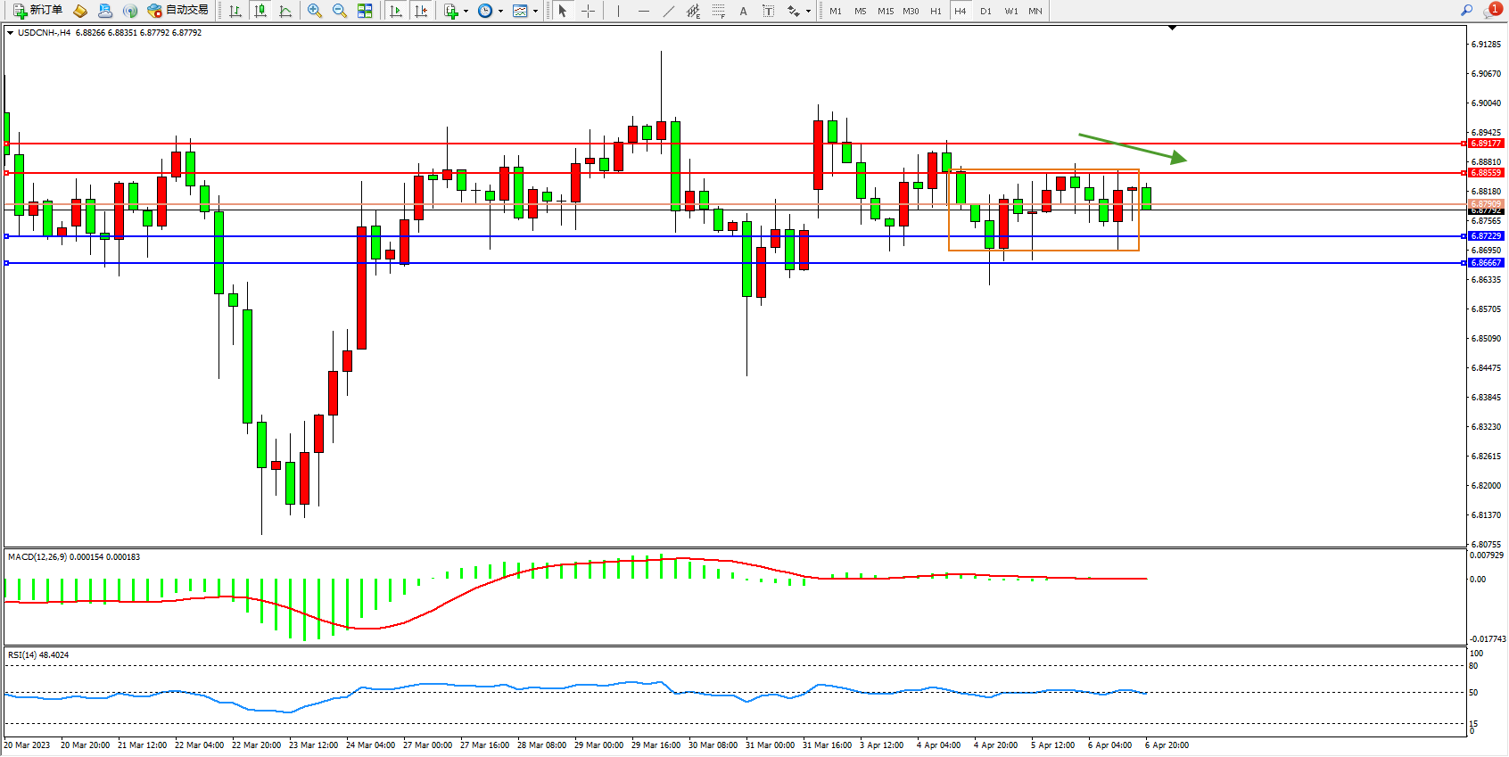 美元人民币USDCNH——4小时K线图显示: