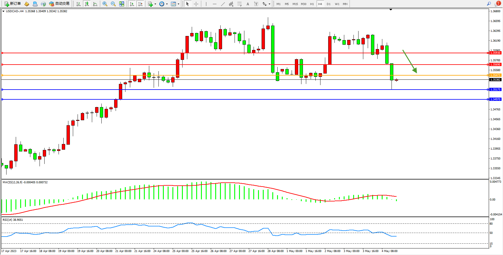 美元加元USDCAD——4小时K线图显示: