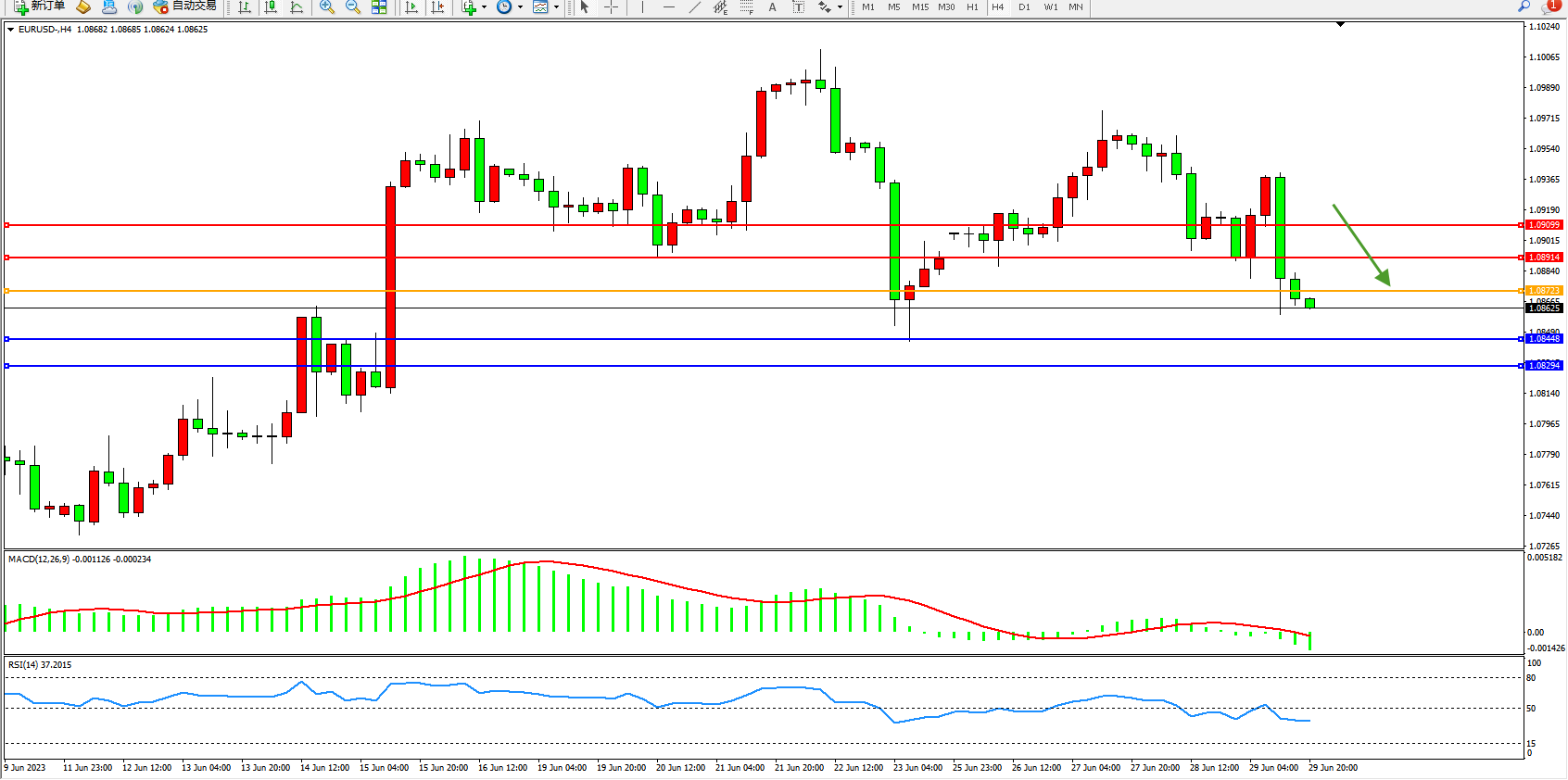 欧元美元EURUSD—4小时K线图显示: