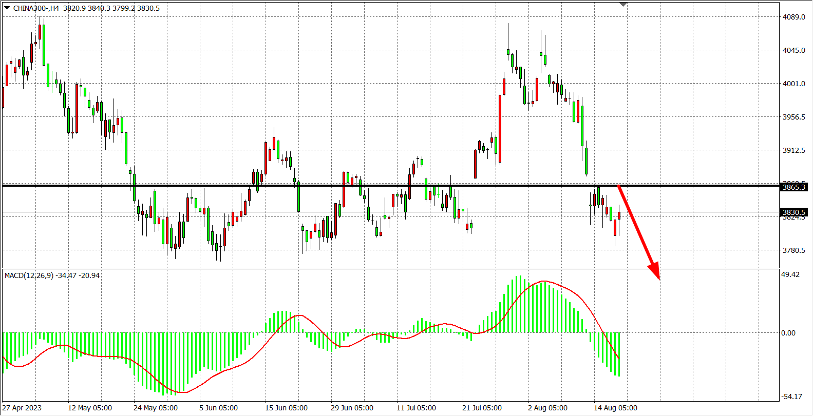4小时图看,沪深300在3865之下走低,MACD量能在零轴下走强,压力继续关注3865附近,下方支撑关注3800-3770一线。