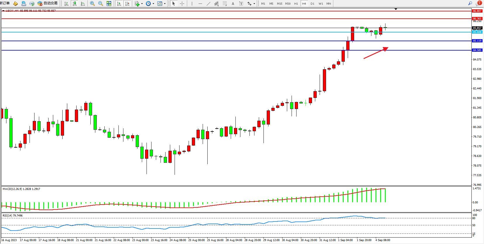 原油维持85.857附近震荡,OPEC+数月来减少供应的努力占据了现货市场,而中国表现出了提振经济的新决心,中国是全球原油消费的关键引擎,国际油价随后一路飙升。
