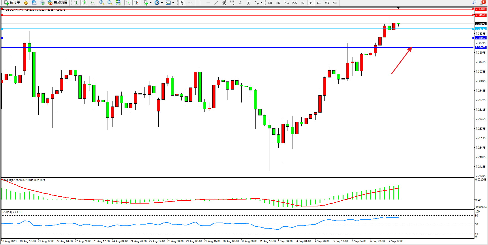 交易策略:7.33712上方看涨,目标7.34650 7.35080