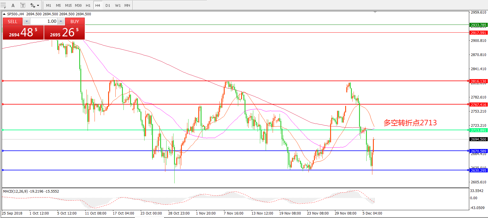 4小时图看,标普500连续下破关键支撑,整体价格直接跌至55周期均线以下,21周期均线稍有拐头迹象,MACD红柱缩短。小幅反弹后有继续回落可能,重点关注多空转折点2713一线