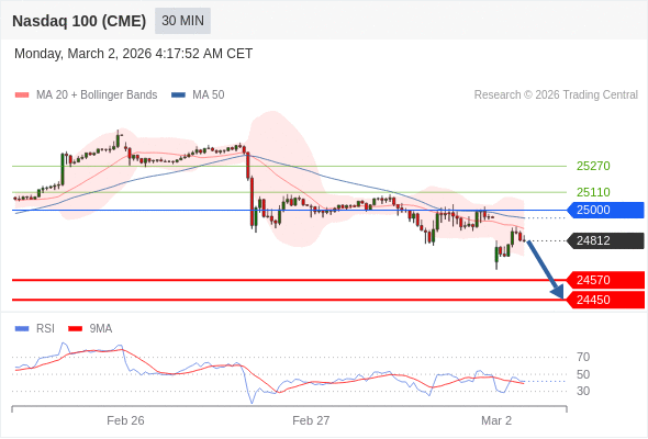 交易策略: 在 25000 之下,看跌,目标价位为 24570 ,然后为 24450 。