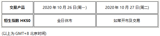 因应20201026(周一) 为香港市场重阳节假期,恒生指数HK50将于假期当日全天休市,敬请阁下留意知悉!