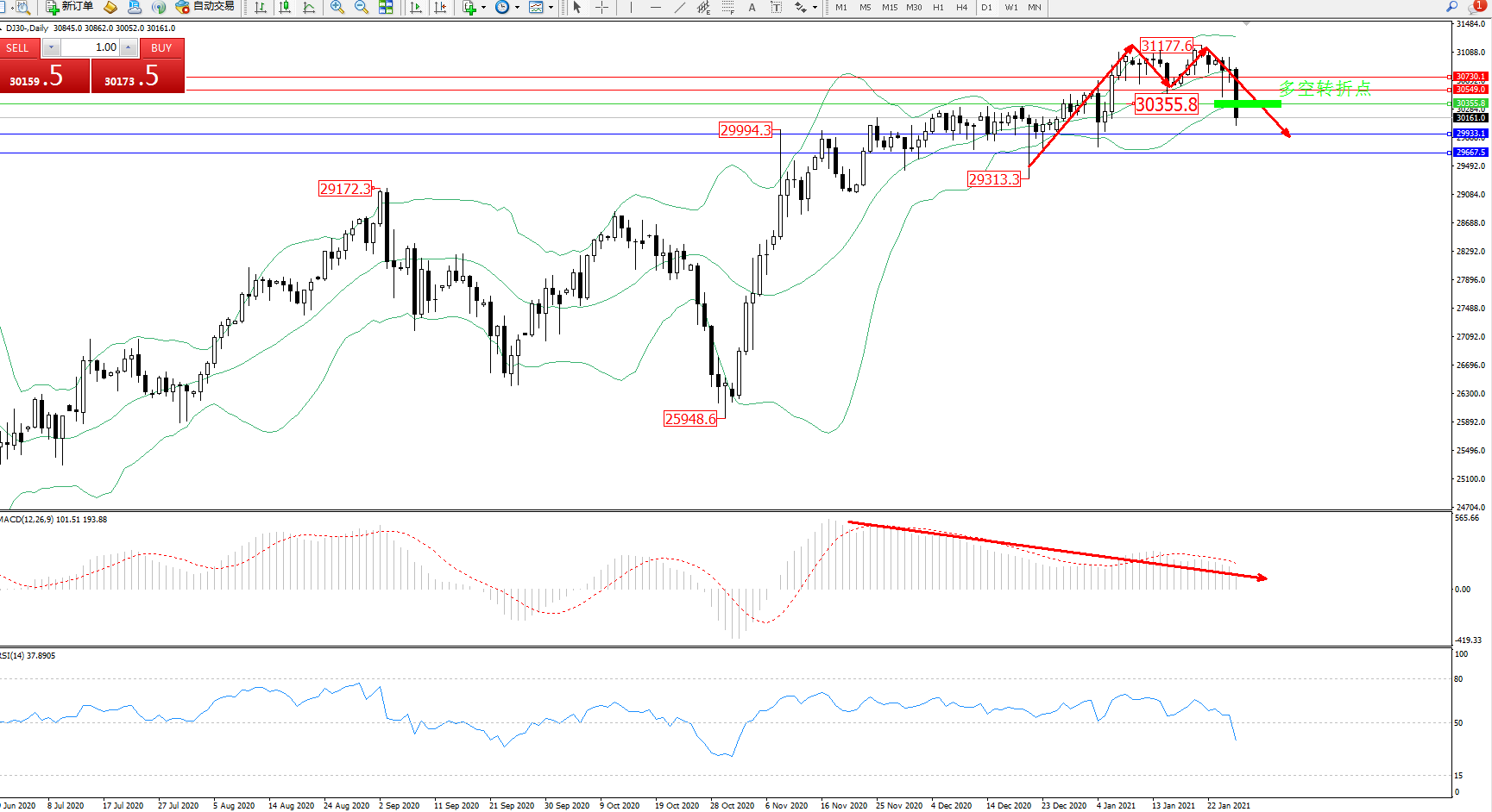 道琼斯指数DJ30—— 日K线图显示: