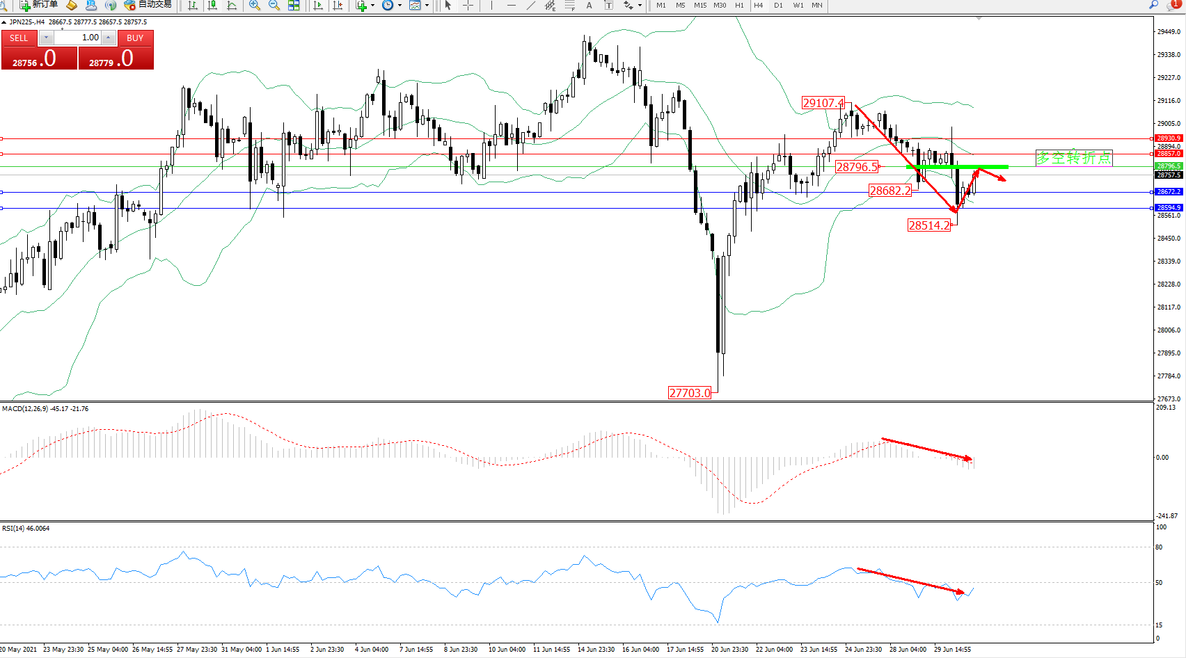 技术点评:空头动力延续布林带指标通道中下轨区间持续震荡下行,低位抵达28514位置后得到短暂支撑反转上移,但下行趋势态势良好,布林带指标呈缓慢张口走势持续中,MACD指标处于0轴线下方空头区域维持不断下移中,RSI指标处于50均衡线下方空头区域维持整理中;