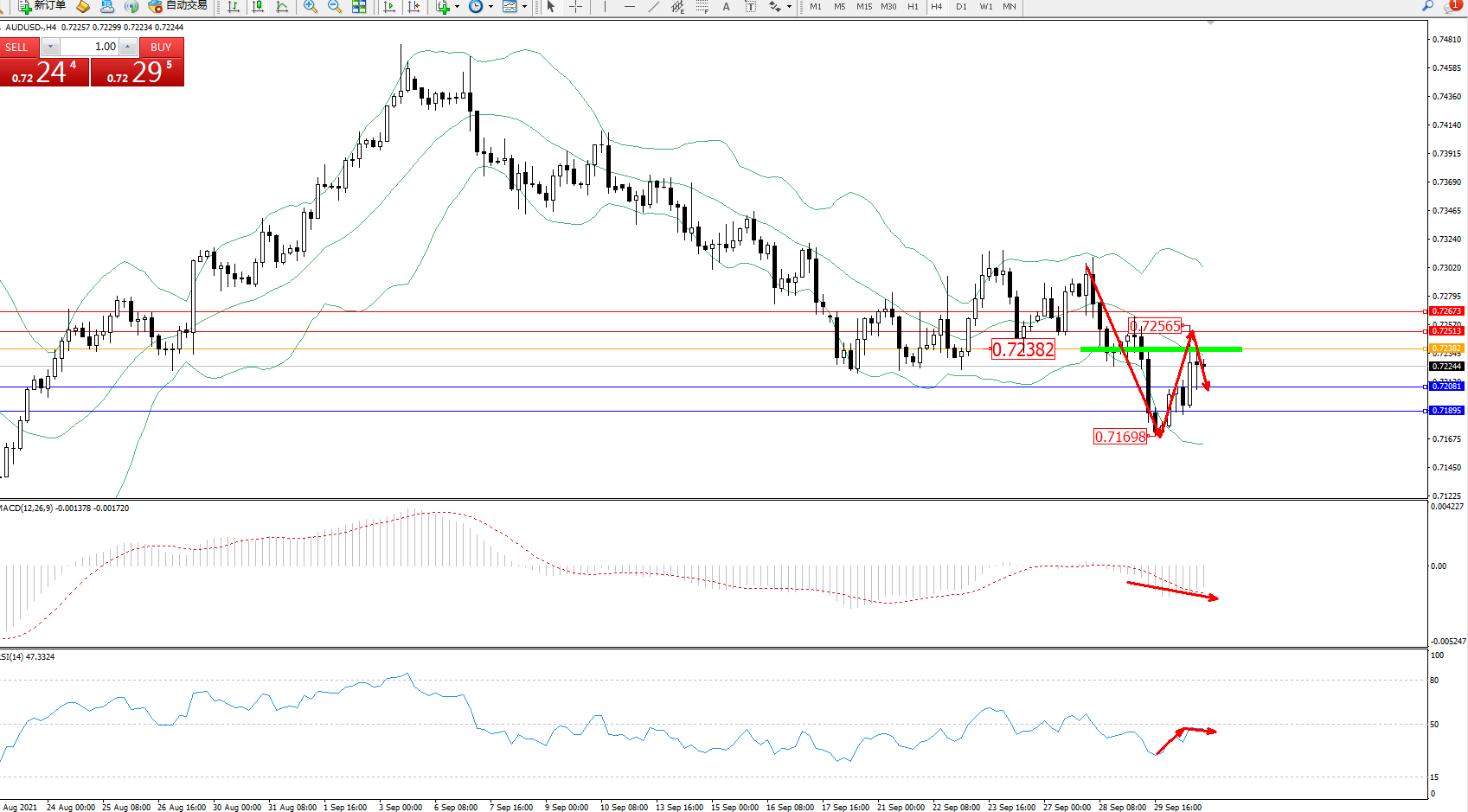 交易策略:0.72382下方看跌,目标0.72081、0.71895