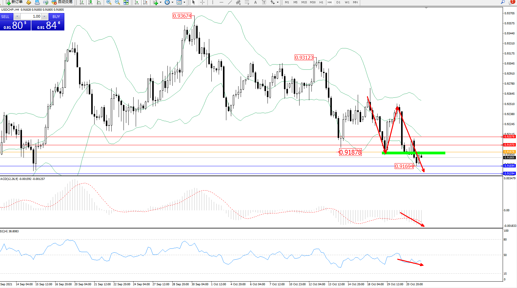 交易策略:0.91878下方看跌,目标0.91694、0.91594