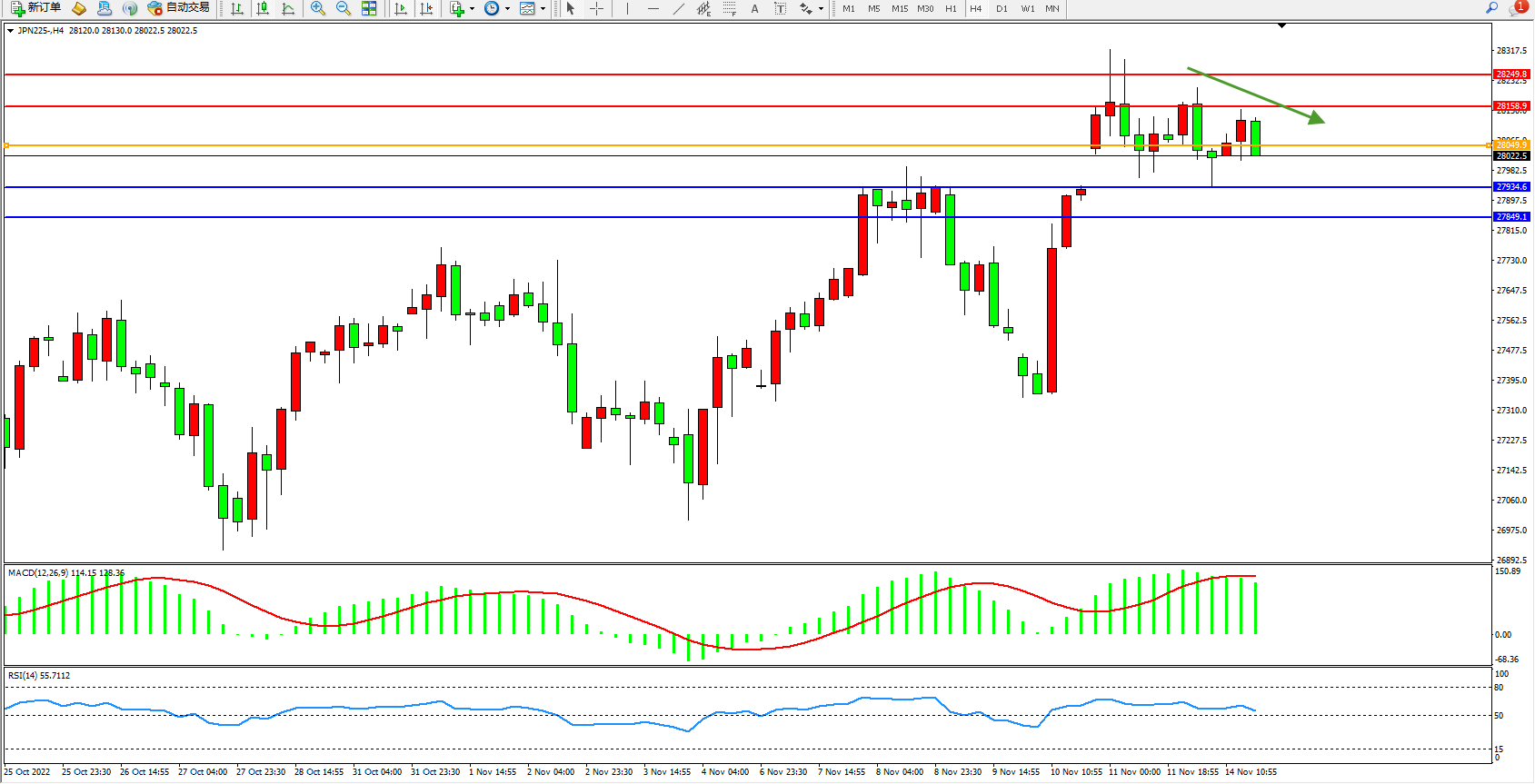 日经指数JPN225——4小时K线图显示: