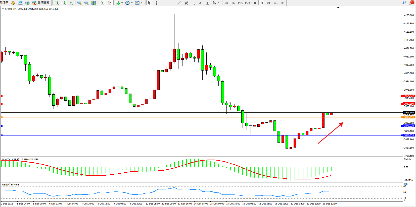 标普SP500——4小时K线图显示: