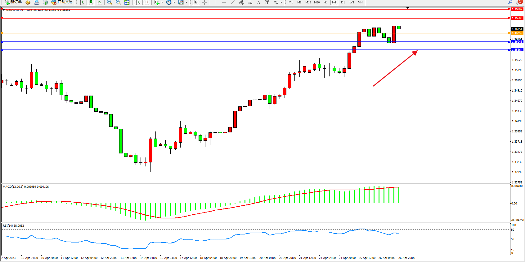 美元加元USDCAD——4小时K线图显示:
