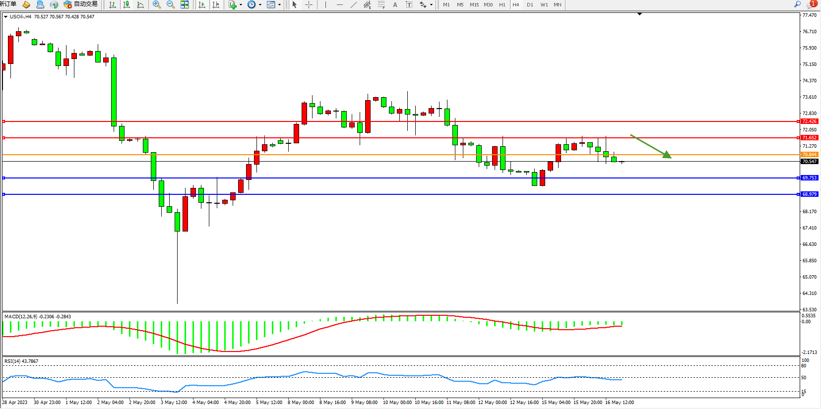 原油维持70.547附近震荡,IEA月报:受中国经济反弹影响,石油需求增幅将超过预期。中国的需求恢复超出预期,3月份创下了1600万桶/日的历史新高。预计今年下半年全球需求将超过供应近200万桶/日。