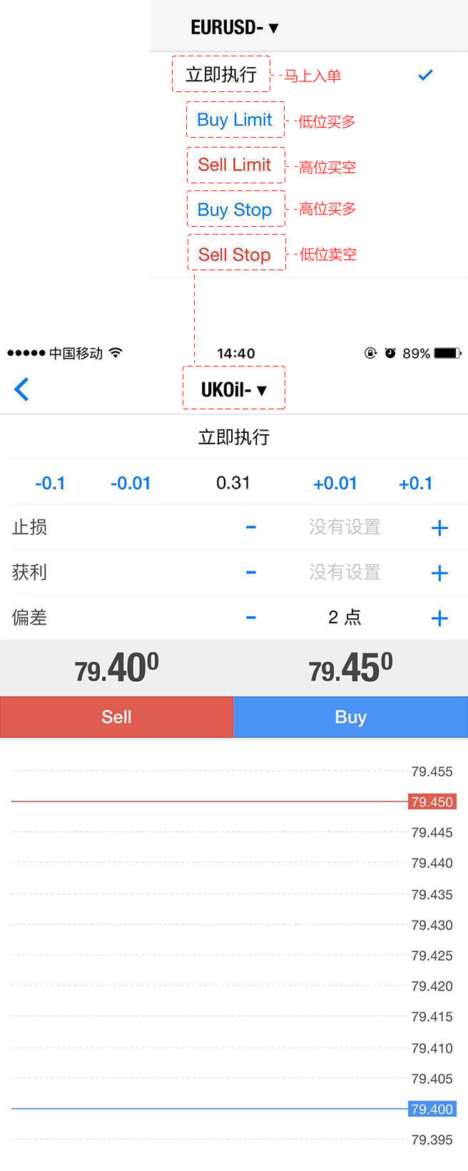 订单类型包括立即执行、Buy Limit、Sell Limit、Buy Stop、Sell Stop、。