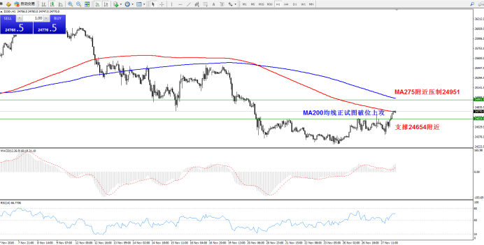 技术点评:底部支撑开始上移,短期关注24654附近,上方压制位于MA275均线24951附近,目前正试图上攻突破MA200均线的压制,MACD指标多头区域上扬中,RSI指标进入多头区域短期平衡;