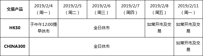 由于中国大陆及香港市场春节假期休市,中华指数(CHINA300)将于2019年2月4日周一至2月8日周五全日休市,恒生指数(HK50)将从2019年2月4日周一12:00至2月7日周四期间休市!敬请留意!